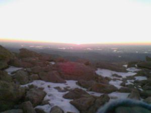 I got to the summit at 6:25am, only a minute or two ahead of the sunrise. The wind was absolutely brutal, so I only stayed long enough to sign the summit register and snap a couple pics with my phone (it was easier to get to than my camera), then I got the hell off and came back down the mountain. I was the first one up today, which was pretty cool. Passed a few people through the long, steep climb on the way down. Here’s a shitty pic of the sunrise from 14,259′.