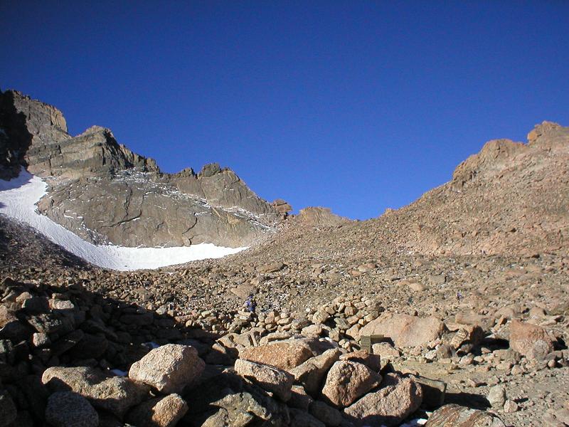 After this, it turns from a tough hike to a moderate climb. The mountain drops off a couple thousand feet on the other side of the keyhole, you go down, and follow around the mountain for maybe a mile of climbing at 35-45 degrees in ice and snow. It’s considered the worst part of the whole way. Get past that and you’ve got a few hundred yards of “the narrows,” a walkway that ranges from 10-20″ wide above a very, very, very big drop. Screw up too bad here and you’re dead. After that, the “homestretch,” a few hundred feet in a crack in the mountain, pretty steep and you’re at 14,000 feet at this point. No pictures for these parts, because I was more concerned about staying alive. Also, it was very dark most of the way, so pictures wouldn’t have been very useful anyway.