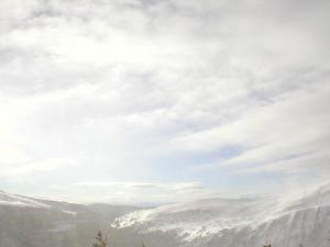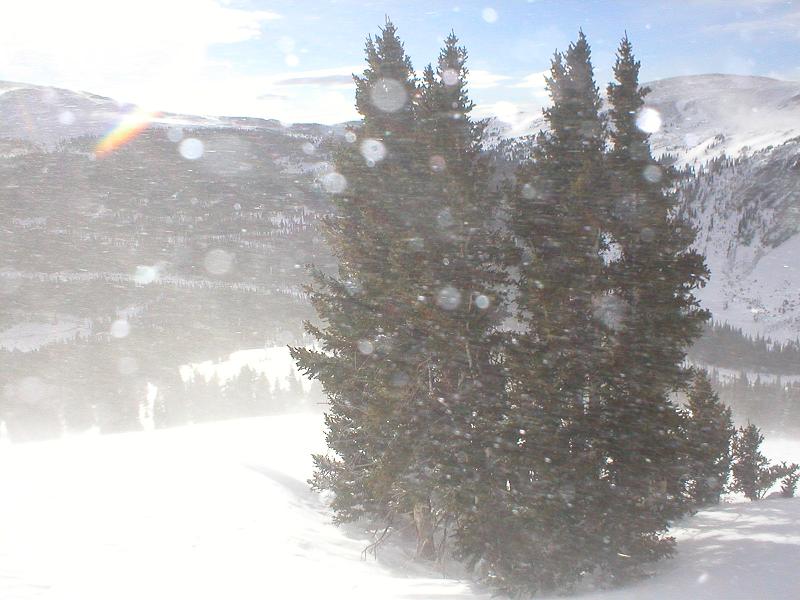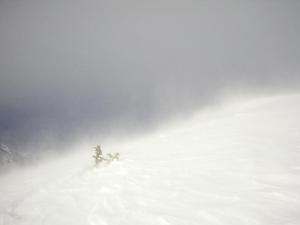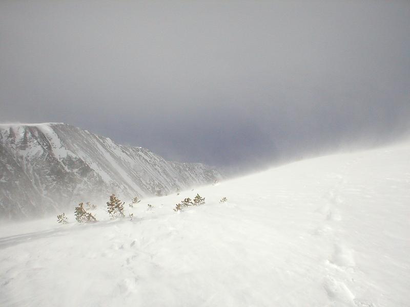 I started to get up higher, which means stronger winds but also generally less deep snow. Things were going well, until the gusts got stronger and lasted longer. Eventually, the gusts turned into the sustained winds. I looked up, and saw some very dark clouds moving in very quickly. The weather forecasted an opening of a few hours between storms – apparently it was wrong.