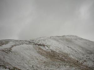 The mountains have been getting dusted with snow since mid-week, and it was still going. Here’s a picture of Mt. Gemini, with the summit poking into the clouds: