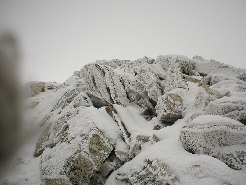 A little higher up the summit ridge, there were a bunch of rocks with some cool snow patterns on them. Also, notice the gray skies again: