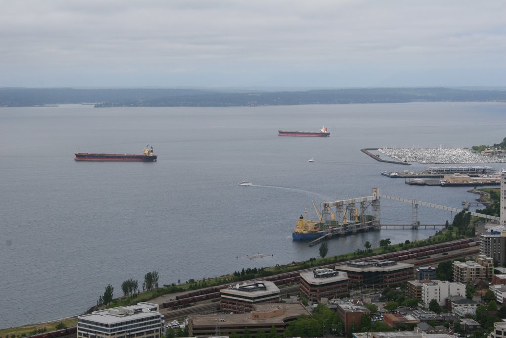 After a little driving around finding our way, we made it to the Space Needle. Surprisingly, it was cloudy and cold. Here’s a shot of the bay from the observation deck: