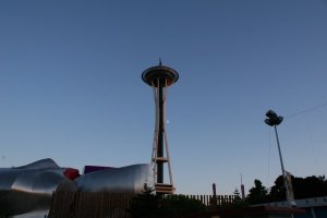 Not many of the other views came out well. From there we walked along the waterfront to get lunch at a crab place that served surprisingly little crab. After that was Pike Place Market, which was very cool and interesting. Katrina had 5lb of the most ridiculously huge crab legs overnighted to her dad, then we went to the Pike Street Brewery. We showed up right in time for happy hour, so I did the sampler in pint form. Our first round was purchased by some guys from Seattle’s network steam utility. I need to give one of them a call and talk a while, because I was so stunned by the area that I’m considering moving out there one day. Two hours and several postcards later we worked our way to the art museum, which was fairly small but interesting. After that we headed back to the Space Needle to change and get ready to head out for some night life. Here’s the only other decent shot of the night, just before heading out: