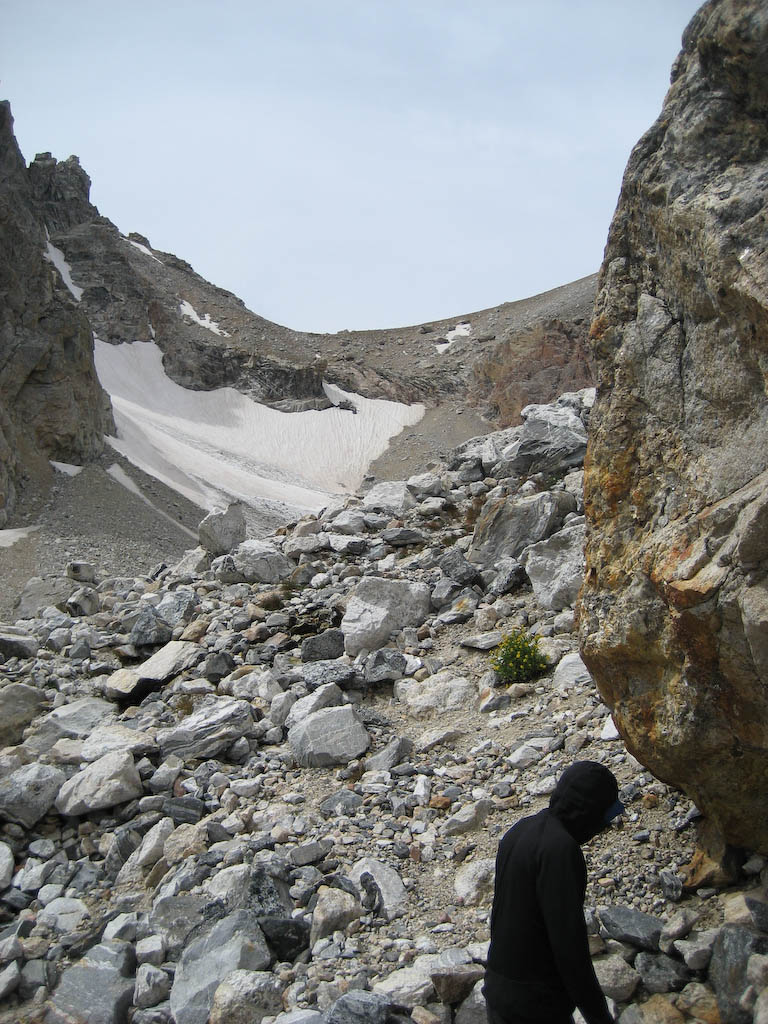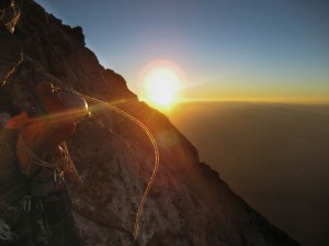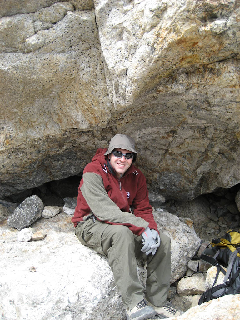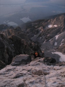Here’s me, hiding in a cave during an hour long break me and Andy (guide) took to hang out and rest for the final push. At this point, it was official. We would try for the Exum Ridge, winds permitting. Since Andy hadn’t been there for the classes, I thought I would have to try to convince him, but based on what Stephen said about my performance, Andy had already decided we should go for the ridge. This was a good thing.