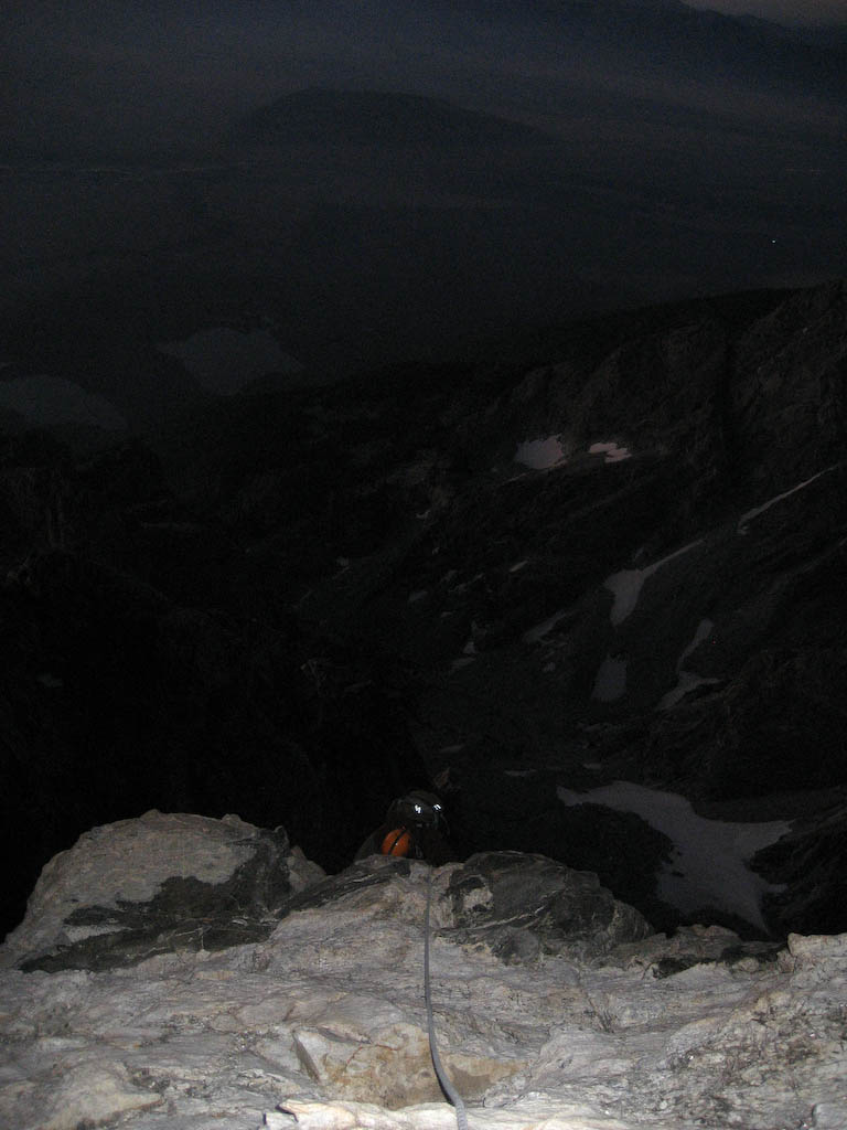 After 15 or 20 minutes, we got up for the descent. The standard descent route for the Grand, regardless of route, is Owen-Spalding. As we stepped into the shadows, it felt like walking into an ice box. We passed some of the people who had been in the hut the night before, and offered words of encouragement. After a bit of belayed downclimbing, it was time for the rappel. There’s a reason we did the large free-hanging rappel, and it was to get ready for this. You can make out the rope if you look closely. I was on a 35m rope, and had about two feet left when I finally got my feet on the ground. Fun!