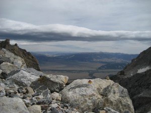 Today was the hike up to the saddle between the Grand and the Middle Teton. It would be a tiring hike, 5,000′ of vertical over 7 miles. It was a late morning, not getting started until almost 10:30. It was a nice cool day down low, light clouds and a gentle breeze. As we moved on the winds picked up. We encountered party after party who had to abandon their bid for the summit due to excessive winds. At one point, we passed two climbing rangers. They had made the summit via Owen-Spalding, but said it was the windiest they had ever seen it. We would later check the weather (there’s a station on the saddle run by the park service) to see that there were gusts to 88mph the night I stayed up there.
