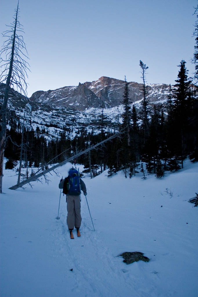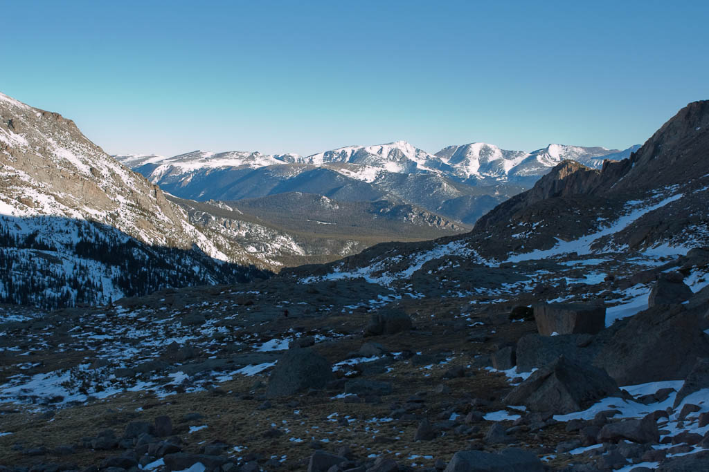 Not much later we got our first view of the objective. Longs is the big rectangular protrusion, with the Trough cutting down below it. Keyboard of the Winds is just to the right of it.