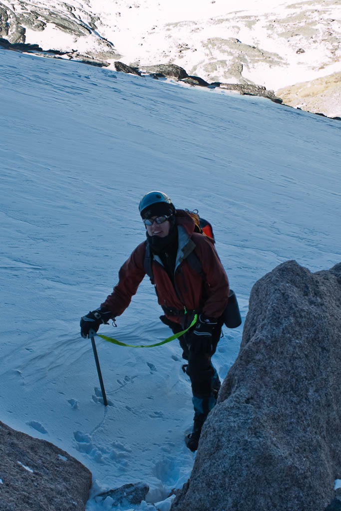At the top of the Trough is a chock stone that I remembered (from my first two trips up here) as near-vertical. Turns out it’s not, and I scrambled up it with crampons on without an issue (and it was nearly devoid of snow). We took a break here before taking off the crampons, and heading for the narrows. This is the most exposed portion of the route, but wasn’t too bad.