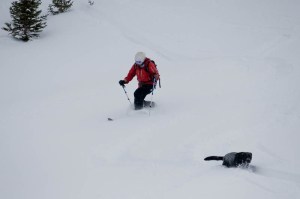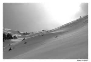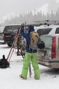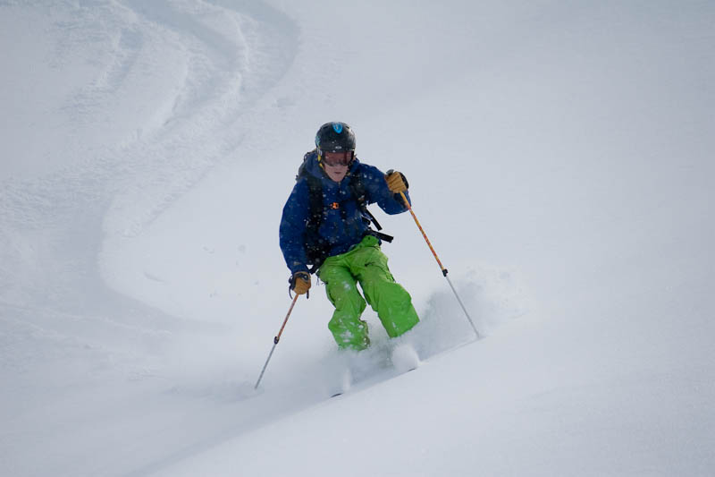 A couple hours later, we topped out for the day. We didn’t go much higher due to time and also avalanche risks. Any higher and the slope steepened up, and the trees cleared out. Given October’s avalanche record, I’m very cautious right now. We de-skinned, and I took off to enjoy some turns and get set up for taking some shots. Unfortunately, there was a tele-binding issue which held things up a bit.
