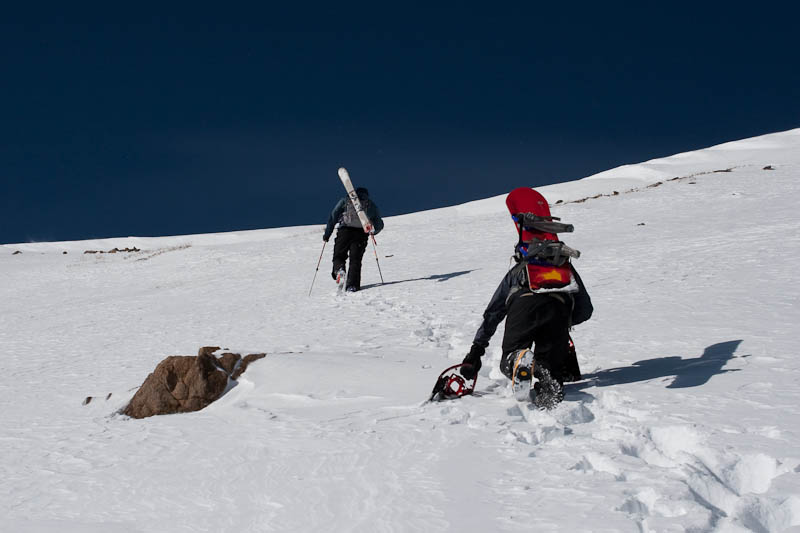 After a rest break and a little bit of sun exposure and heating, the snow got terrible for climbing. It rapidly softened, to the point that skinning or edging was impossible, with the top few inches sliding off an extremely hard layer underneath, hard to the point that my new BCA snow saw was having trouble with it.