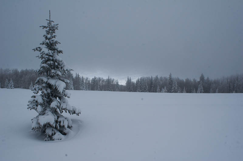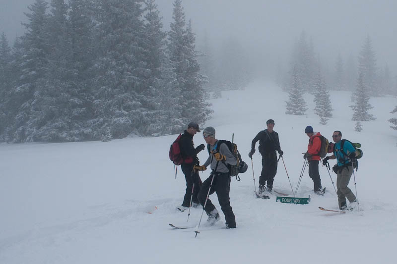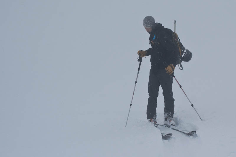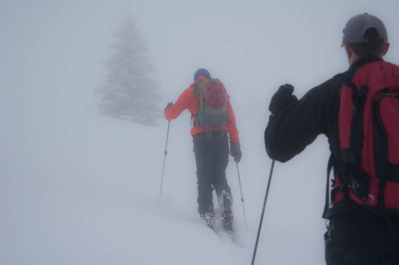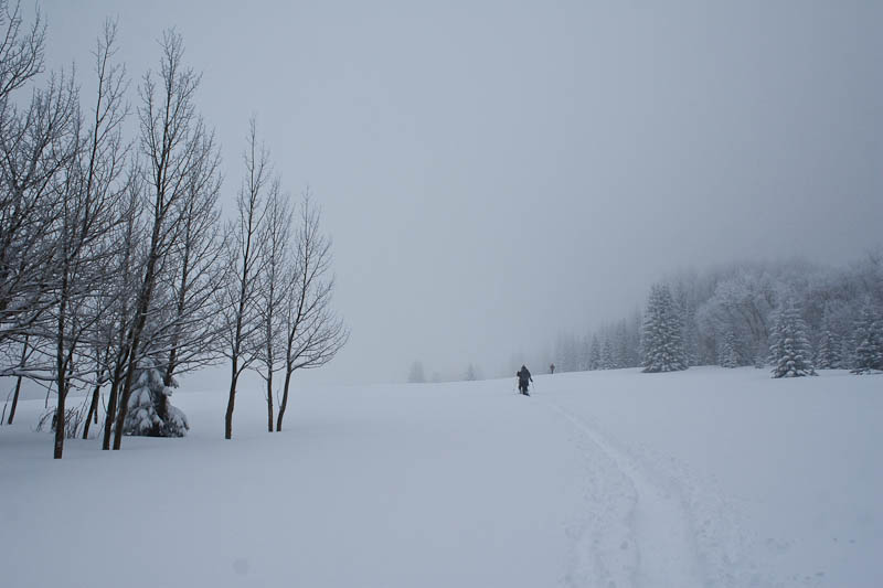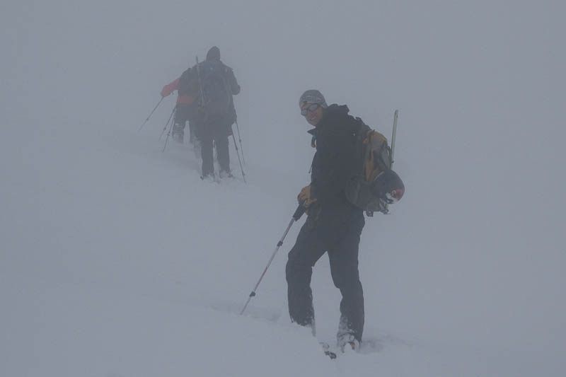 But eventually we did, and a few of us started rotating trailbreaking duty. It’s exhausting work, but somehow Jake managed to break trail more than half the way, and made it look effortless. Eventually we came to a clearing, and got a good view of just how poor our view was going to be.