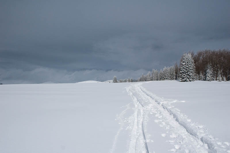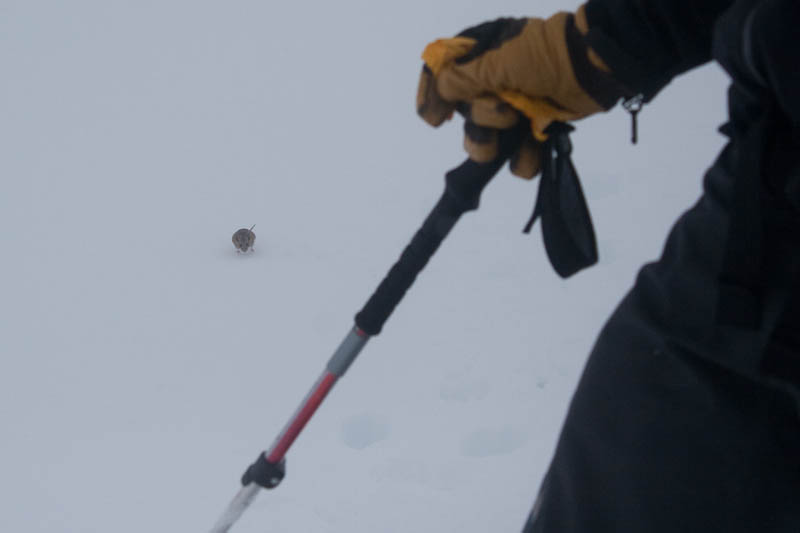 Right then, a very nonplussed mouse, which had been jumping around following us, charged at Carl, nearly hit his ski, then ran back and hid in a hole left by someone’s pole basket. We both busted out laughing at the situation; the poor little mouse was probably extremely confused, as only a couple days prior it was warm, sunny, and grassy, and suddenly there were a couple feet of snow on the ground.