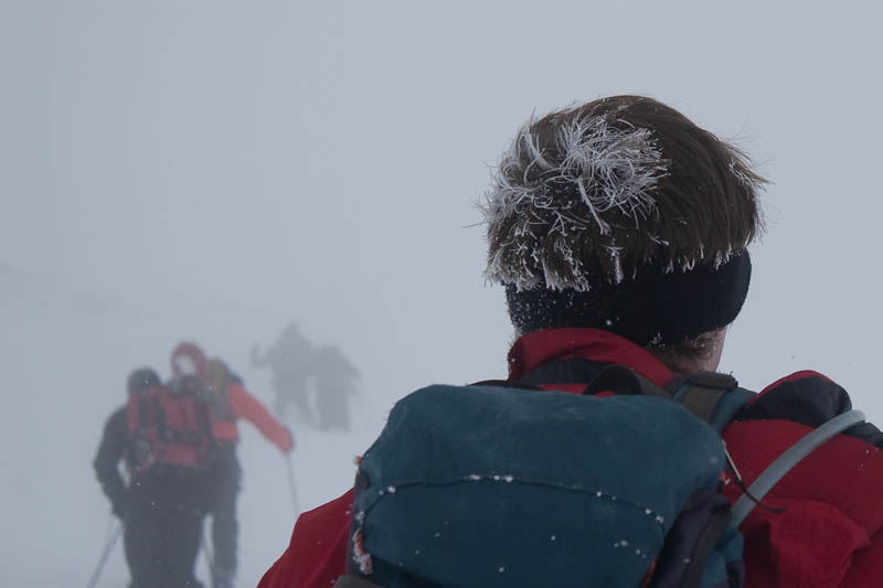 A little bit later I saw something I’d never seen before – rime growing in someone’s hair. Ah, such beautiful weather for a climb.