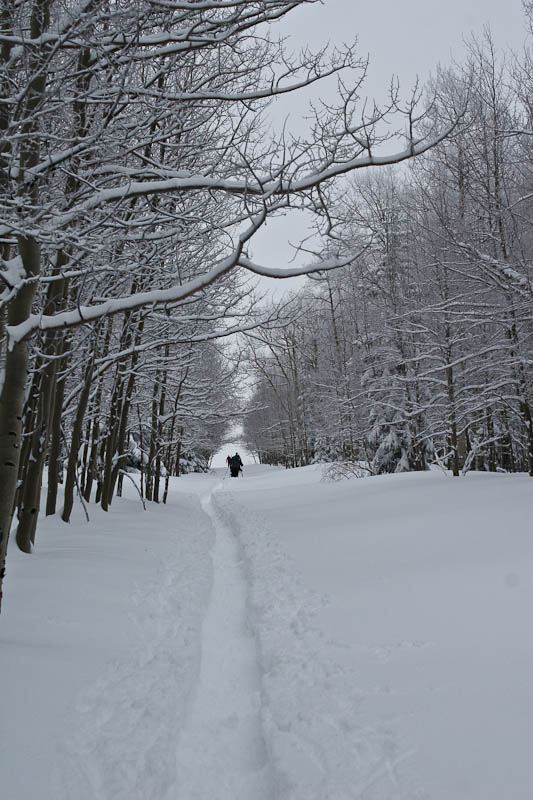 Even though it was humid and the trees completely blocked the wind, temperatures were remarkably comfortable. The approach through the aspens was beautiful, and it took quite a while to catch up to the two snowshoers leading the way.