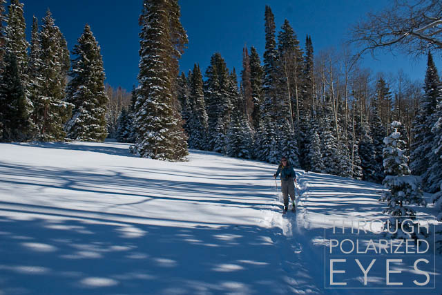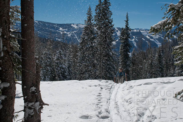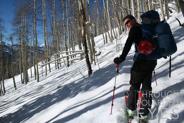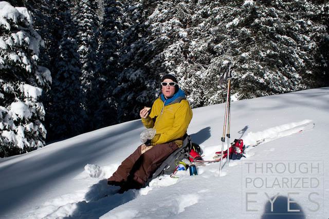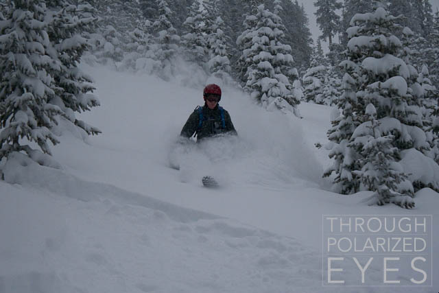 Here’s one of yours truly – notice the cracked brim on my Smith Variant helmet. It happened when I set my pack in the snow, with my helmet on the back. I’m rather disappointed in the breakage, but I’m more disappointed in their warranty department. I talked to them and was offered 30% off MSRP for a new helmet, which is still more than I paid for it. But the pow was amazing.