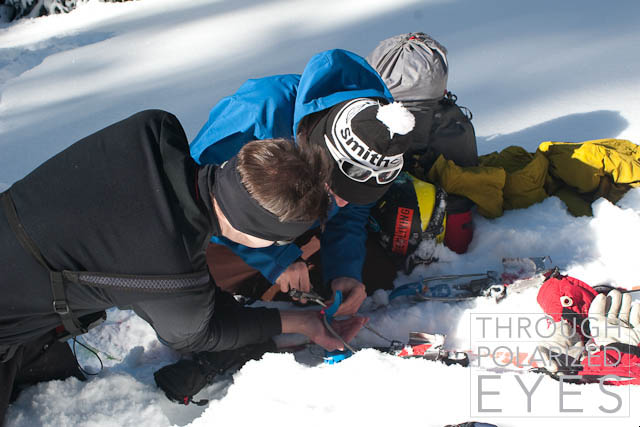 Unfortunately, Hans has since taken up telemarking. One of the many drawbacks is spontaneously-breaking gear. Here’s Hans and Derek performing a field repair of one of his bindings.