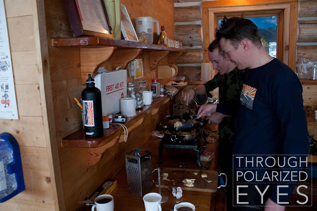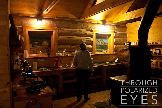 Hans and I took a quick test-lap once we unpacked to check conditions, and were blown away by how good the snow was; and when we returned to the hut, it had started snowing. Eiseman is pretty decked out as far as the kitchen goes, and we enjoyed a delicious chicken and tofu pad thai before hitting the sack. It was fairly early to bed, in anticipation of the day ahead.
