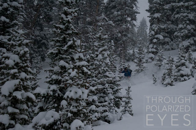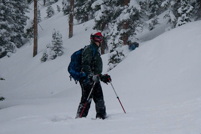 We woke to about a foot of new super-low density snow – the stuff legend is made of – and it was still dumping. About this time, a couple more of our friends were heading in via Red Sandstone.