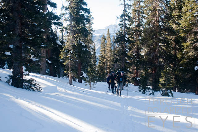 I’d been wanting to get out for a while. 18 ski days for the season before the end of December, and only 3 of them backcountry – and all on the hut trip. When I saw a vague photo from a condition report on 14ers.com that made it look like Yale went from the top, I started planning. The east face would no doubt have better snow, but from scaling a topo I immediately called it a no-go due to steepness. I decided to take my chances on the standard route up Denny Creek. Hans was going to come along, but couldn’t make it; fortunately, a sizable group from 14ers.com was going the same day.