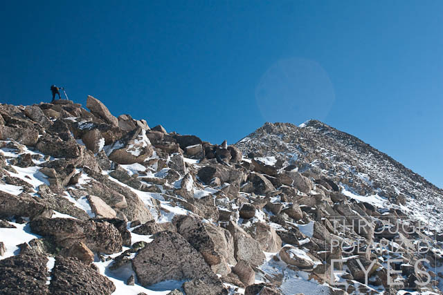 About this time, Jim was gaining the summit – due in large part to his better selection of an ascent route than the rest of us. The scrambling for the next hour was not terribly pleasant for me, but likely would’ve been a blast if I’d been wearing any other footwear at all.