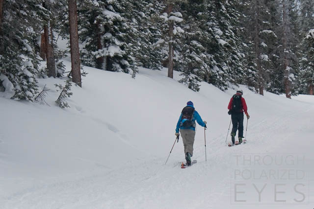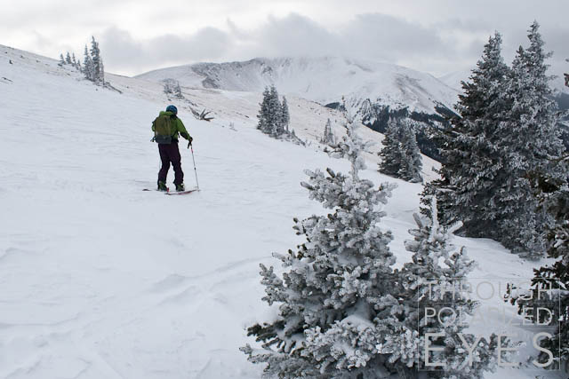 I finally made it up to Berthoud Pass today, and took a couple mellow-ish laps in Floral Park – laps that had a lot more down than up. The snow was decent, but nothing to write home about. Some photos, starting with the skin up: