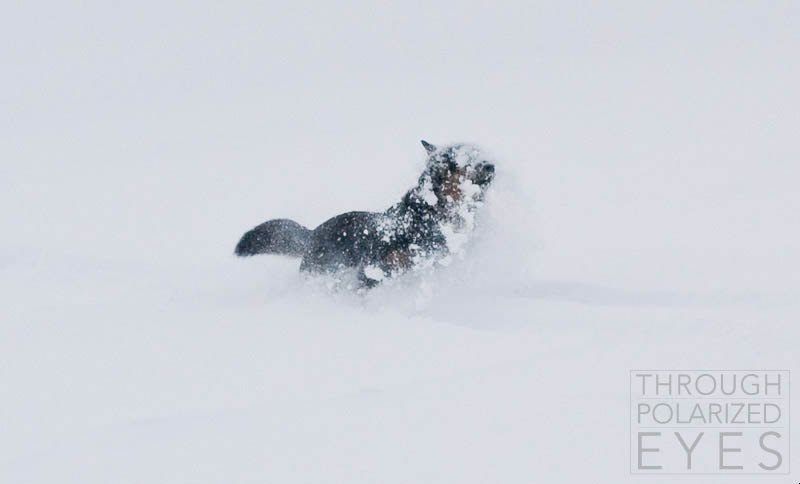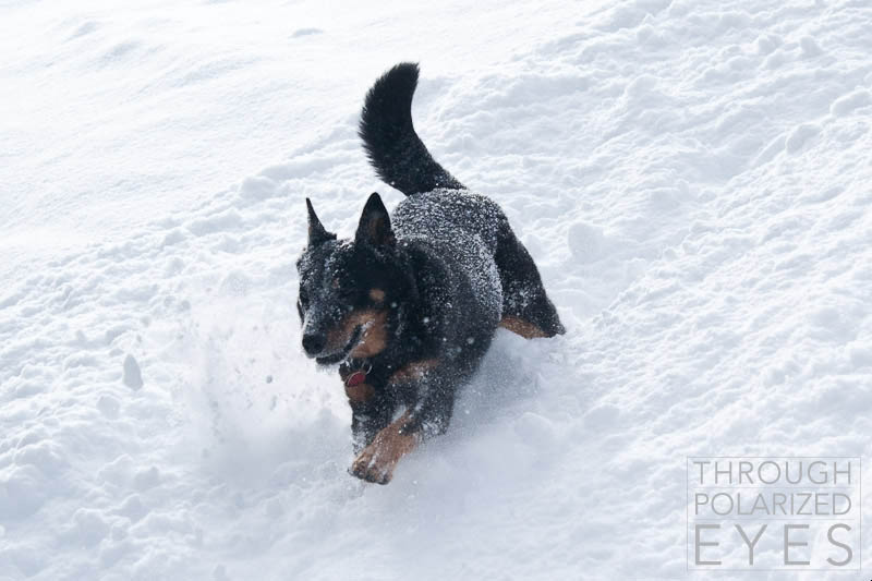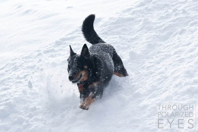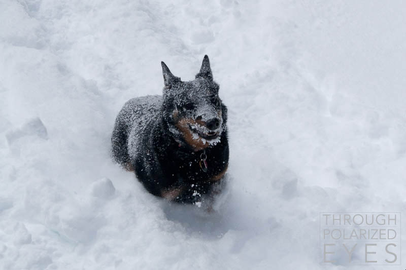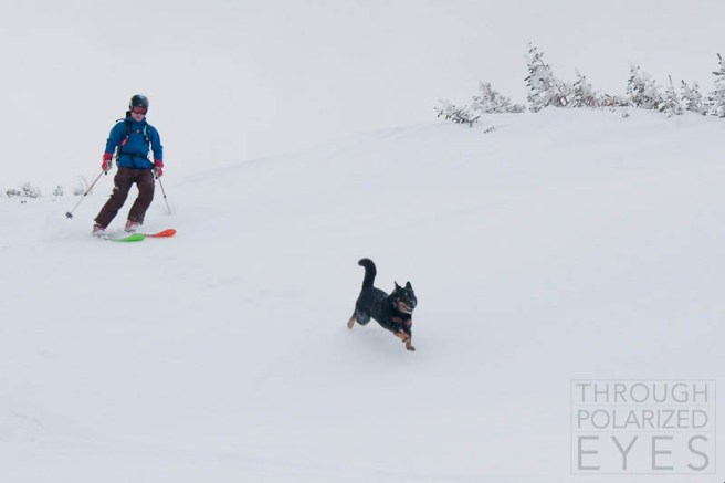 A few good turns later, we were back to flatter terrain with a little more meadow-skipping before the bobsled run out. Scout decided to save energy and stay above the snow by standing on Hans’ skis.