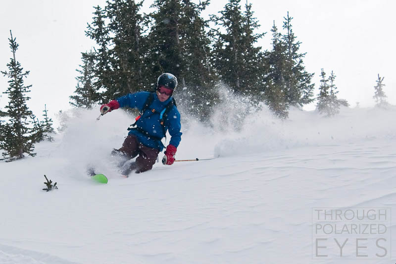 We got up and took a look at Corner Pocket, which had been hit by some pretty funky winds (out of the NNE). We backed off and headed toward some trees a little farther down the ridge for a fun gladed line. I dropped first.