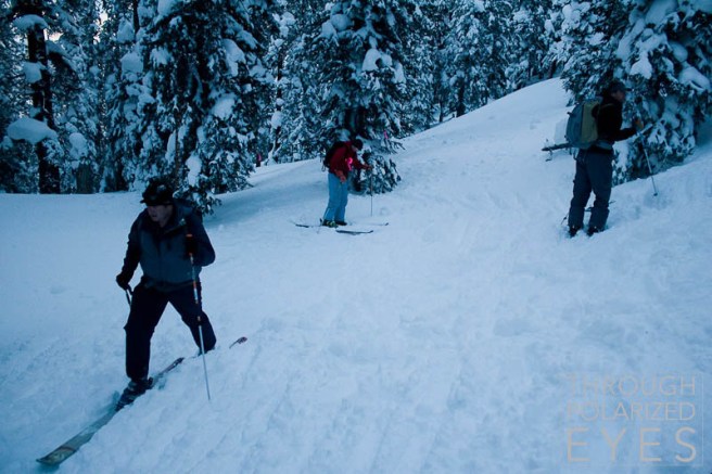 The skin to the first scenario is short – less than five minutes – and then it was time to sidestep down a couple hundred feet of steep trees (to give the appearance of avalanche debris) before digging a big hole.