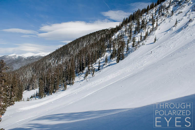 The next morning was a little easier to wake up for, and things went about the same at the beginning. Gary and I had a larger group Sunday, six plus Cody and Scout. Just as we were getting started on the way up, one of our group members asked what the CAIC report meant by the term “backwards loading,” and I explained that winds had been out of the ordinary lately so there was unusual danger in unusual places. We skinned up to the same place as yesterday, not only to show what the wind did to our old pit (it was nearly filled in by blown snow) but because we knew it was a good wind-break. As soon as we got there, we had a great teaching example of that “backwards loading.”