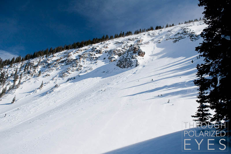 The ridge of Russel broke quite unusually – the expected failure would be on the left side of that flank, not the right. I’ve never seen that ridge slide, and Gary didn’t think he had either. There was also substantial hangfire. You can take a closer look here; take note of the crack just left of the flank. That crack worked its way up ever higher as we were working in our pits, but didn’t let go while we were there. Amazing to watch from afar, though it would’ve been terrifying to be under.
