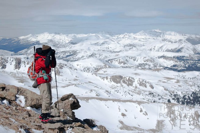 Eventually it was more trouble than it was worth to keep the skis on my feet, so I started booting up the long northeast ridge. Can you spot Jim in this photo? I’ll give you a hint – he’s about three pixels tall.