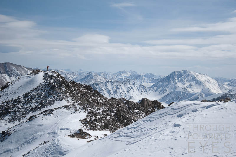 I started getting chilly when he got back, so I locked down, clicked in, and we were off. It was, by far, the best snow off the summit of a 14er I’ve ever experienced – a few inches of creamy powder on top of a soft, supportive base.