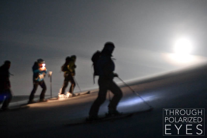 We took a short walk over bulletproof wind-packed snow and ice, eventually got in to our skis, and waited for the moon to illuminate our line.