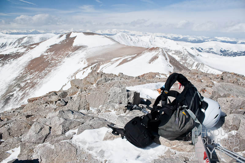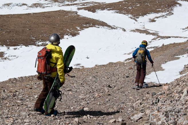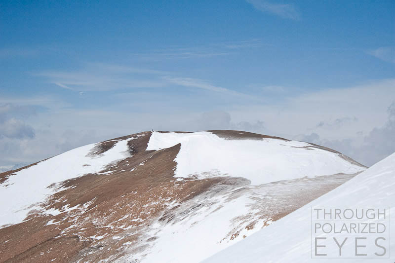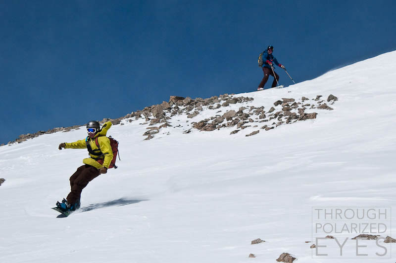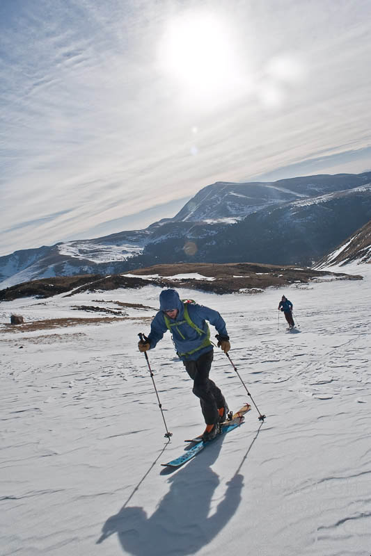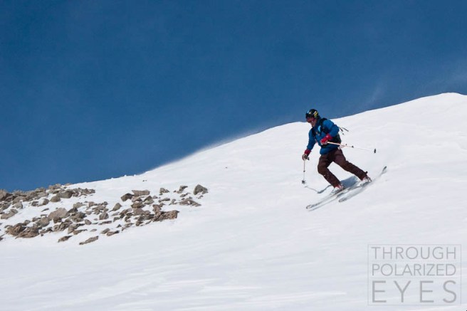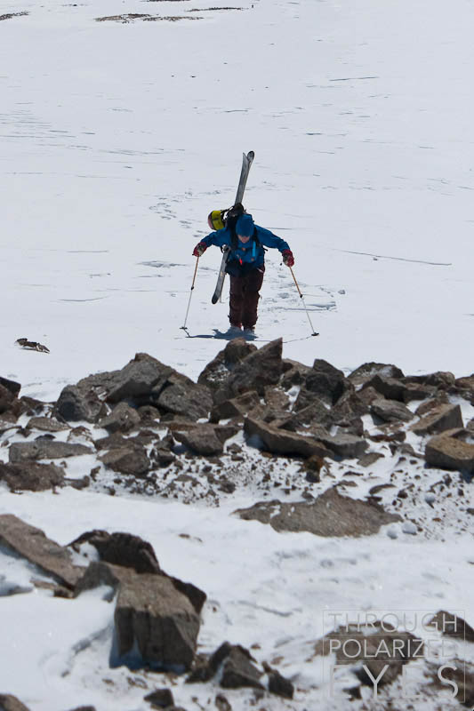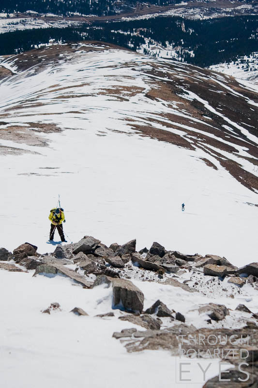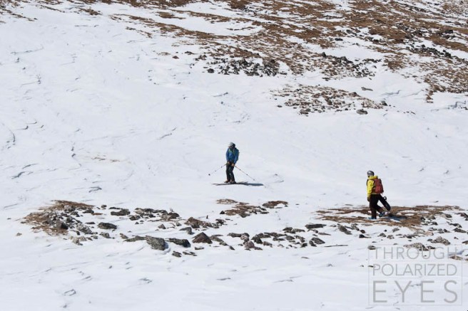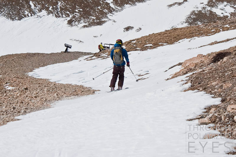 The skiing on 14ers is often unglamorous, and this day was no exception. To keep up quick downward progress, we slid along a drift of snow on a small roadcut for a while.