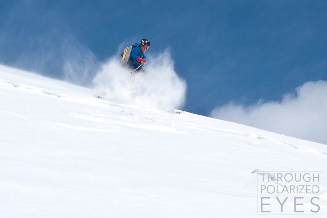 A few turns later, he was caught in a small eddy which wrapped him in snow for a couple seconds – a pretty cool effect.