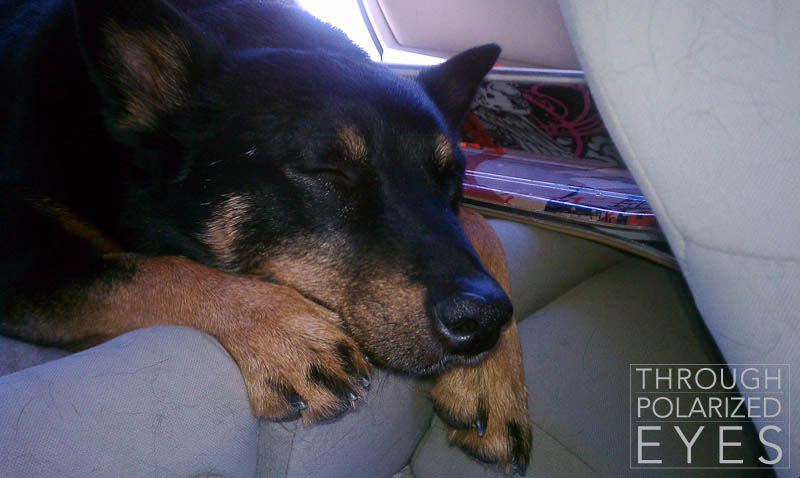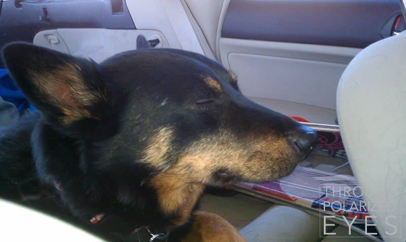 A few minutes later we were back at the car, thinking about breakfast (it was only about 9am at that point). Scout got a bunch of food and water, Lauren and I packed up, and we hit the road. Normally Scout will stay awake on car rides, because they’re just so exciting. She really tried her best.
