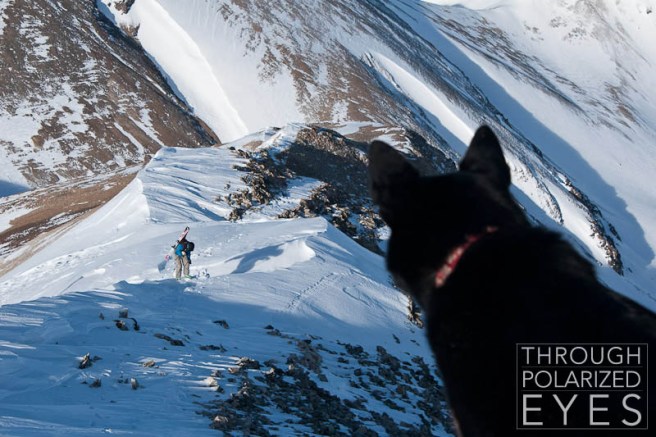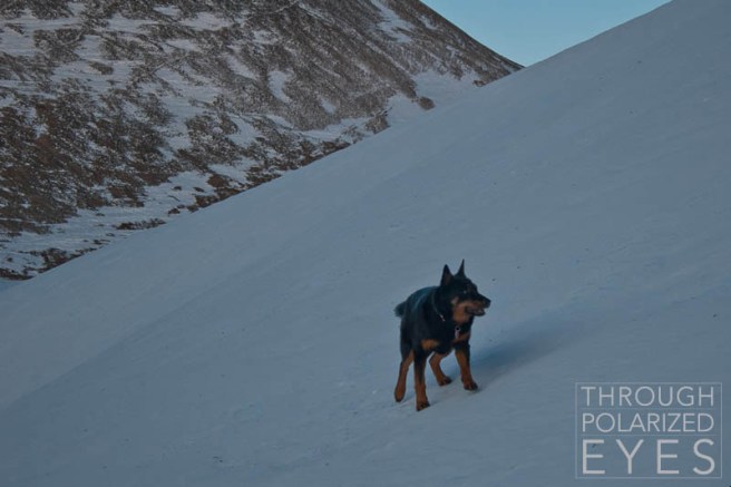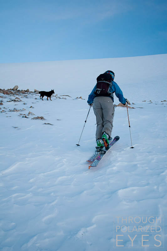 Scout’s a natural at this, and handled the icy crust better than Lauren and I did (except when she ran downhill and couldn’t stop). This is about where we threw our skis on our packs and started booting, because of a total lack of traction. I’m glad I brought a whippet.