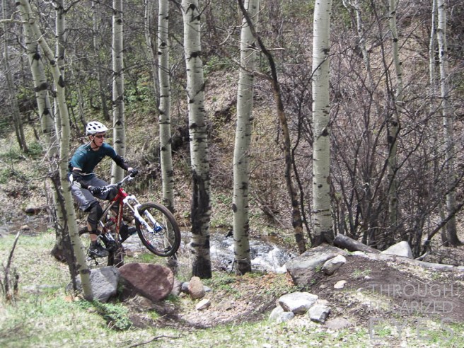 A couple minutes in to the day I bailed off my bike at the top of a pretty big berm, and my bike ended up upside-down in a tree. I wish I’d taken a photo. We went to the site of this video, though Andrew did it a little more cleanly.