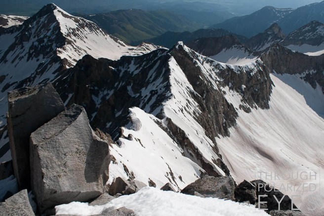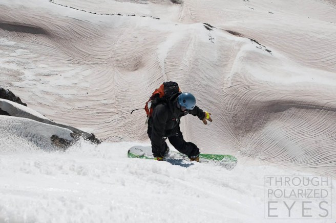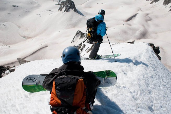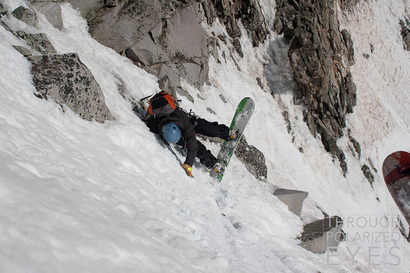 At one point, Marc almost became the first person to have a ghost-ridden snowboard descent of Capitol. It slid down out of sight, tumbled a few times, and then…silence. Marc angrily yelled about it for a moment before Carl and I saw that it had stopped on a ledge about 20′ down. One more bounce and that would’ve been about 2,000′, and Marc would not have been the second to snowboard from the summit of Capitol Peak. After that round of excitement, we made our final preparations and got heading down.
