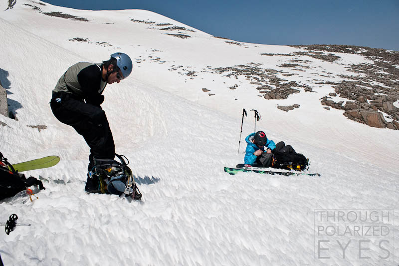 We had time for some summit shots, snacks, relaxation, and boot repair, as we waited quite a while for the snow to soften.