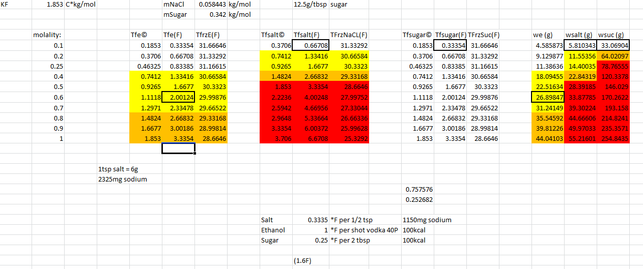 I imagine that will be an unintelligible mess for most, though there is an order to the chaos. In addition to ethanol, I looked in to the effects of sugar and salt. If there are any chemists out there who see I’ve made a grave error somewhere, please let me know so I can correct it.