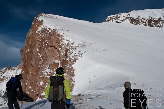At this point is the section that gave us trouble. In all the mid-winter reports I’ve seen, there is a section of rock that is blown clean by the wind. This year, one of the worst seasons in recent history, the section was heavily loaded. We spent over 15 minutes staring at it, measuring slope angles, discussing possible tactics, and the consequences of an avalanche (certainly fatal) before ultimately giving up.