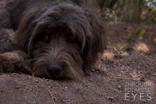 T1 was uneventful. I brought knee and elbow pads (due to concerns raised when I pre-rode the course) but decided to not put them on – a good choice, because it seems quite a few of the trickier sections were sanitized before race day. Sophie was happy to lie in the shade.