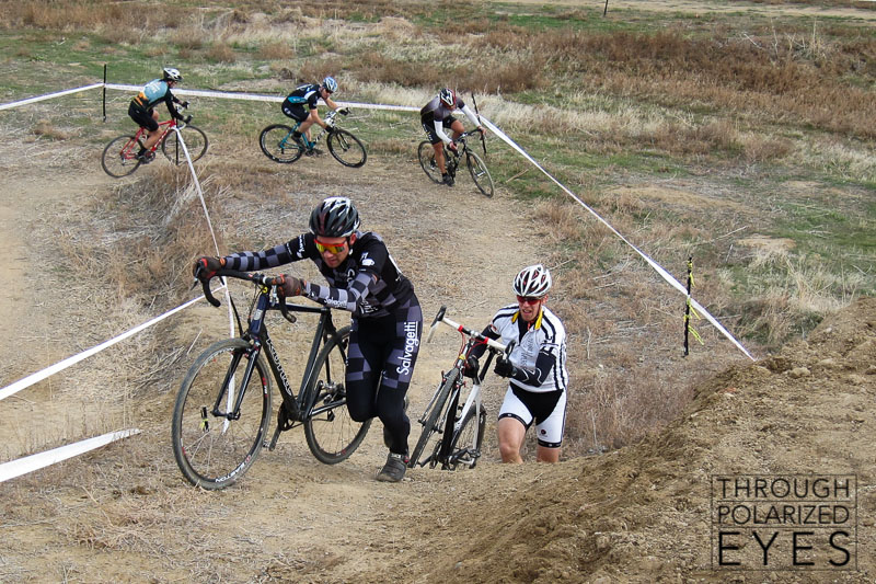 With an inch of clay covering her shoes, Lauren gave up trying to clear them. Before the SM4 race, the entire field was trying to clear mud from their shoes and pedals, to no avail. As soon as racers stepped off their bikes for a run-up, their shoes were immediately coated in clay. I spent about 1/3 of my race trying to get clipped back in, which isn’t a good recipe for putting power down. By the later races, the course was dry, fast, and smooth.