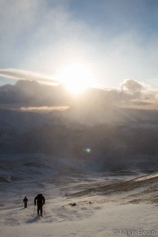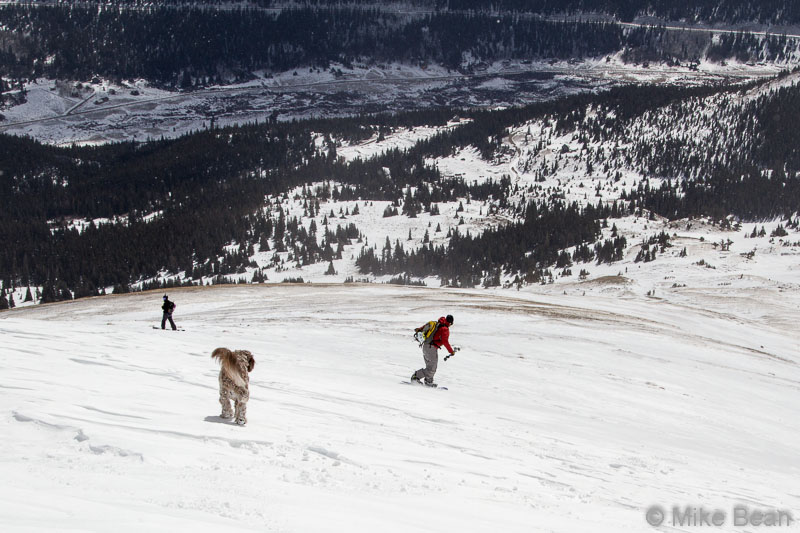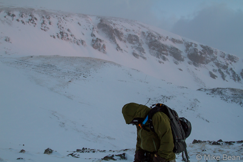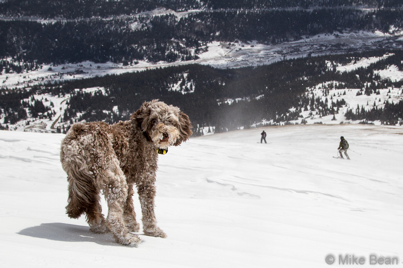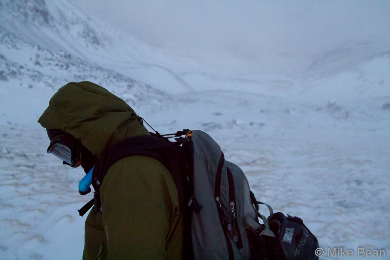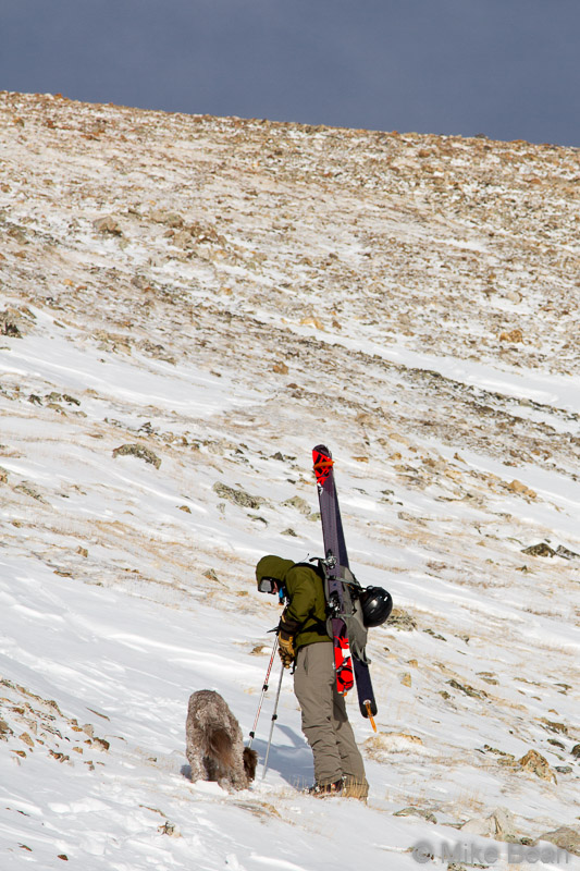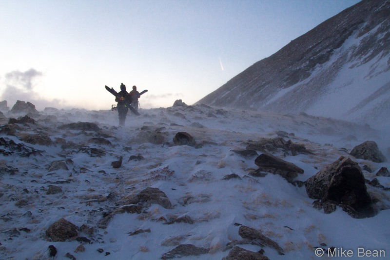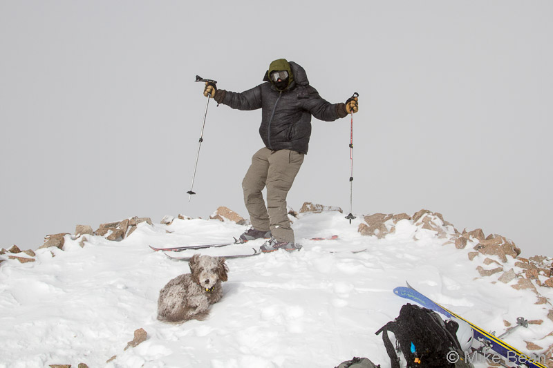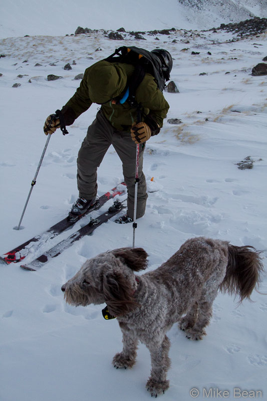I sometimes wonder why I do this to myself. Out of bed at 2am. Driving at 2:45. Hiking at 5:20. Questionable snow conditions. Horrible winds, well above the forecast. I managed to convince Nate to come, while Marc and Eric actually wanted to go. Sophie will follow me to the ends of the earth, though I wouldn’t have brought her had I expected the ground blizzard she put up with.
