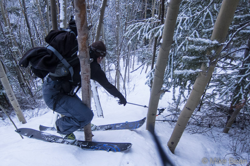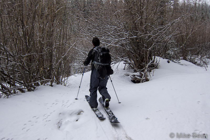 Back to the misery trees, we skied out as far as possible. The lower we got the worse the snow was, with near-constant submarining for both of us. Marc had a particularly rough time at this spot.