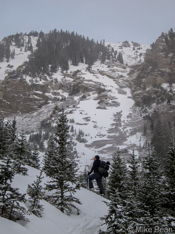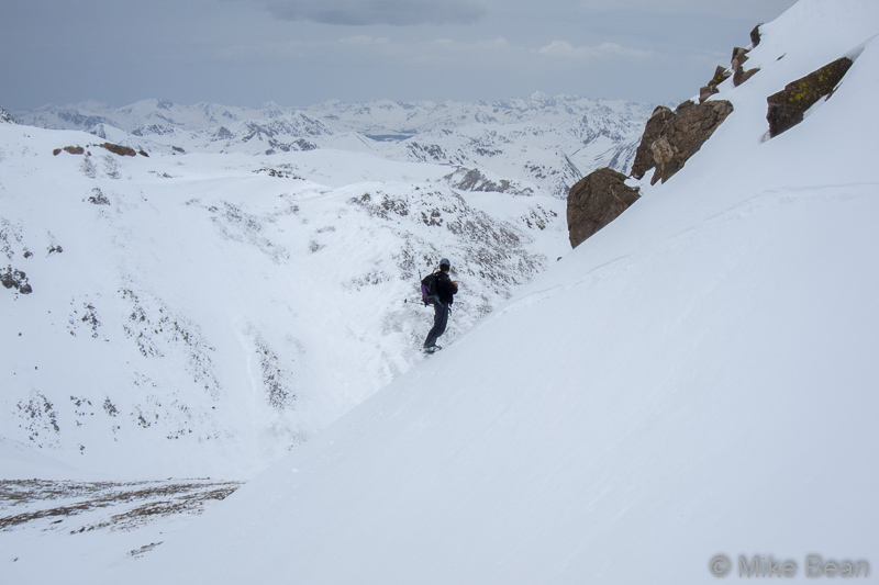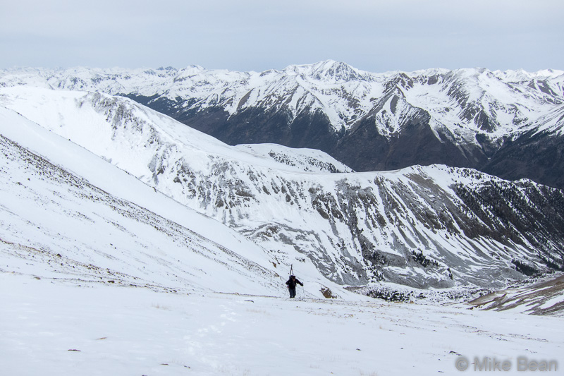 It was fairly warm and humid, without a very good freeze in the valley. Something about Missouri Gulch seems to hold clouds in, as I’ve dealt with rotten, unsupportive snow every time I’ve been up there.