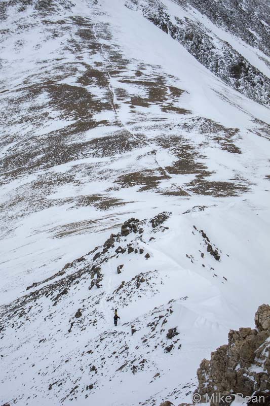 We took the main NW gully direct, going one at a time from safe-zone to safe-zone. We weren’t particularly concerned about anything coming down on us, but it’s never a bad idea to follow safe travel procedures. We were also both still feeling Friday’s effort, so the frequent breaks were welcome. After an hour or so we popped out to Belford’s summit ridge.