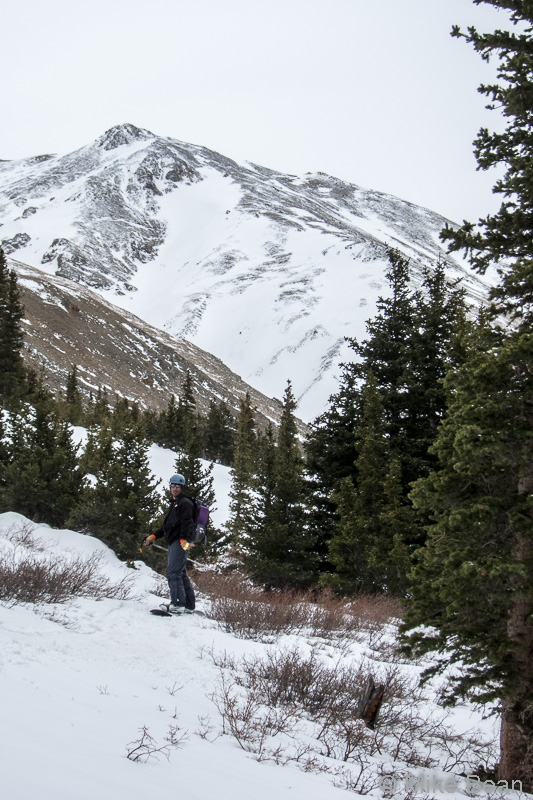 Onward and upward through the “misery trees” we went, switchbacking through trees and breaking trail through unsupportive snow.