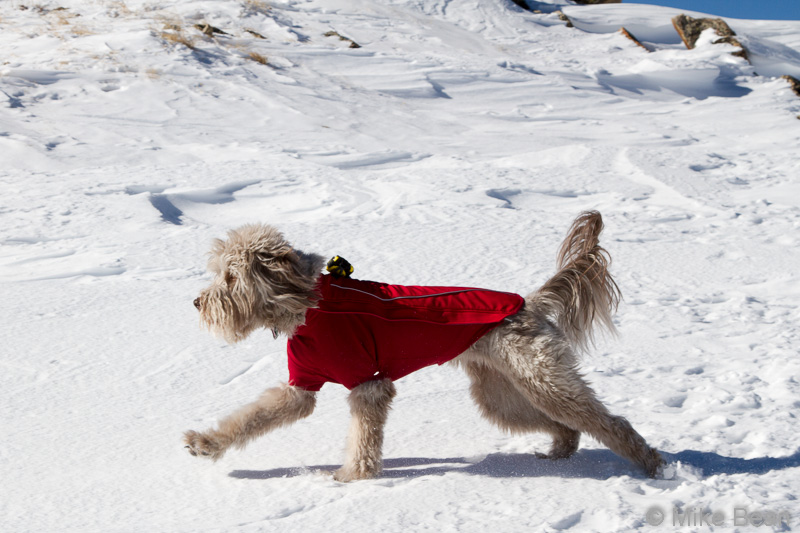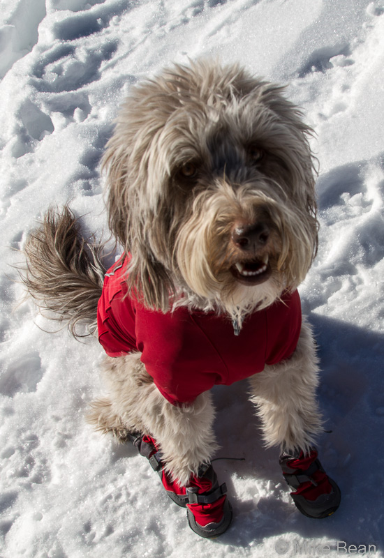 Sophie has had some pretty bad balling and clumping issues in the past, so I picked up a jacket and booties to help keep her happy. Long reviews short: the Ruffwear Cloud Chaser worked great but needs to be taken in a bit at the waist and have a pocket added for Sophie’s TX600 beacon, while the Ruffwear Polar Trex booties all fell off inside of a minute despite being sized correctly and tightened as much as possible.